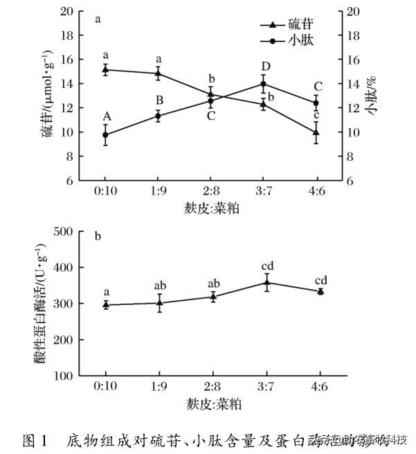 底物組成:考察發(fā)酵底物中麩皮與菜粕的比例(0∶10、1∶9、2∶8、3∶7、4∶6)對發(fā)酵后產(chǎn)酶及酶解后硫苷、小肽含量的影響。