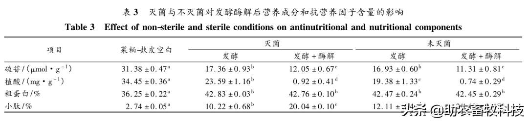 表3結(jié)果表明,黑曲霉在滅菌與不滅菌的菜粕麩皮混合培養(yǎng)基(初始發(fā)酵水分 60%、吐溫80添加量0.05%)中發(fā)酵酶解后,除小肽含量外,硫苷、植酸、粗蛋白含量均無明顯差異(P>0.05)。同時(shí)結(jié)果表明,未滅菌發(fā)酵對硫苷、植酸的降解及小肽含量的提高效果均優(yōu)于滅菌后發(fā)酵,推測由于滅菌后導(dǎo)致培養(yǎng)基中部分營養(yǎng)成分流失,使得黑曲霉發(fā)酵效果變差。最終經(jīng)未滅菌的麩皮菜粕混合培養(yǎng)基發(fā)酵酶解后,硫苷含量從31.38μmol/g降解為11.31μmol/g,植酸含量從34.45mg/g降低至1mg/g以下,小肽含量提高至21.19%,占粗蛋白含量的49.92%。