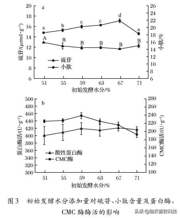 初始發(fā)酵水分:考察不同初始發(fā)酵水分(51%、55%、59%、63%、67%、71%)對發(fā)酵后產(chǎn)酶及酶解后硫苷、小肽含量的影響。